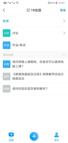 通过学习通建立每一门课程的班级群,开展教学过程中的通知、签到、思维导图及相关学习资料的推送、作业及章节测试的收发等教学活动,以实现教学过程的高校管理。