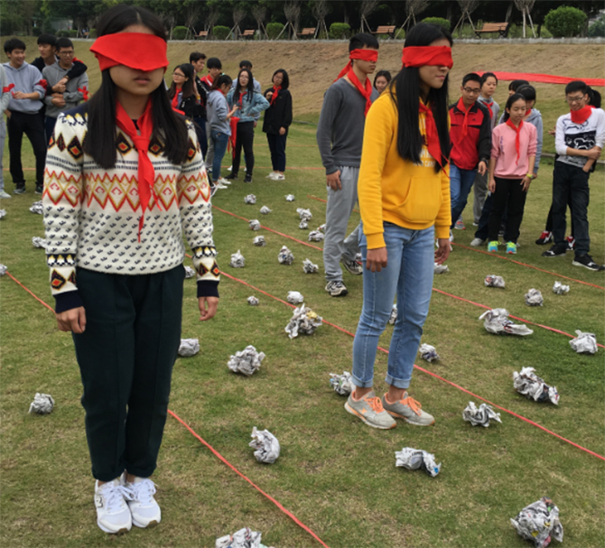 第一个游戏结束后,同学们来到第二个游戏场地。工作人员用红领巾蒙住四位“侦查员”的眼睛,剩下的四位“指引员”来指引他们到达终点,并且“侦查员”途中不能碰到“地雷”。现场弥漫着紧张刺激的气氛,同学们小心翼翼的摸索前行。