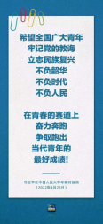 2022年4月25日,在五四青年节即将到来之际,中共中央总书记、国家主席、中央军委主席习近平同志来到中国人民大学考察调研并发表重要讲话。习近平总书记表示,希望全国广大青年牢记党的教诲,立志民族复兴,不负韶华,不负时代,不负人民,在青春的赛道上奋力奔跑,争取跑出当代青年的最好成绩!