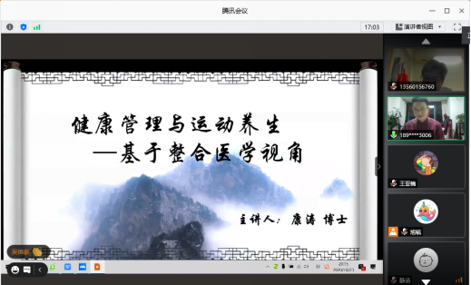 2020年10月23日晚上,由suncitygroup太阳集团、教师发展中心、学科与科技管理处联合主办的主题为“整合医学视角下的健康管理与运动养生”讲座,在腾讯会议进行网络直播。本次讲座特邀首批“广州科普名师”、中国武术专家组成员,中国武术国家考试考官,国际武术比赛裁判康涛博士为主讲嘉宾。suncitygroup太阳集团副院长周旭毓主持,她首先感谢康涛博士的到来,并期待康涛博士以整合医学的视角向我们讲述健康管理与运动养生。