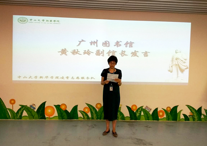 主持人介绍活动流程后,广州图书馆黄秋玲副馆长率先发言,她首先对中山大学新华学院资讯管理系的周旭毓主任的到来表示热烈的欢迎。其次,对凌霄志愿服务队一直以来的努力以及对志愿事业的热忱表示肯定。她指出:广州图书馆是广州的一张文化名片之一,本次双方签订实践基地,能更有效地发挥彼此专长,整合资源,并希望凌霄志愿服务队能通过广州这个平台,为志愿事业提供更完善、更多元的服务,实现强化理论与实践的有机结合。