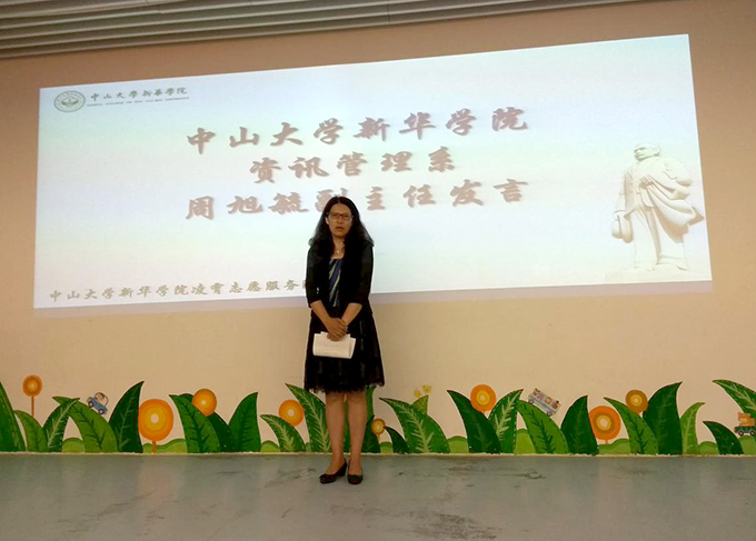 随后,中山大学新华学院资讯管理系周旭毓主任也上台发言,她表示:希望双方以这次授牌为契机,进一步在人才培养、服务社会等方面进行讨论与合作,以适应社会需求为切入点,切实提高学生的实践能力为目标。双方长期携手,共同为志愿事业做贡献。凌霄志愿服务队副队长方殊更是表示:感谢周主任一直以来给予凌霄的大力支持,他将会更好地利用广州图书馆给予的大平台,为志愿事业做更多更好的贡献。