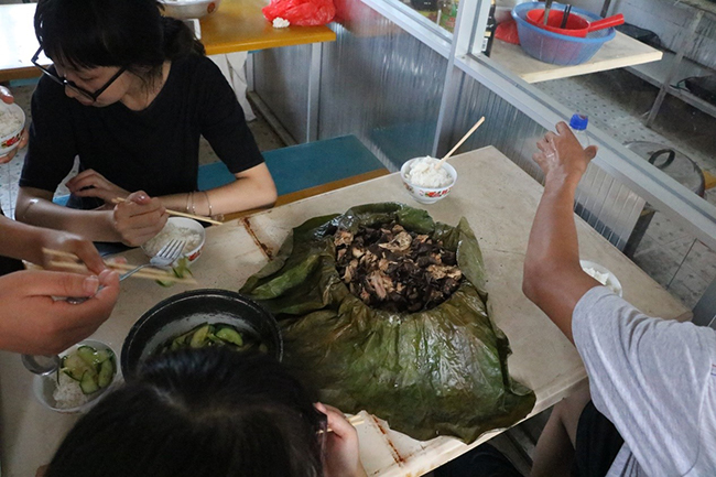 荷叶的清香和着鸡肉的味道,还没有出锅,大家就已经是翘首以待了。闻着荷叶的香气,口水都要流满一地了。后勤组的同学也是早已经饥肠辘辘了,都在等着荷叶鸡的出炉。