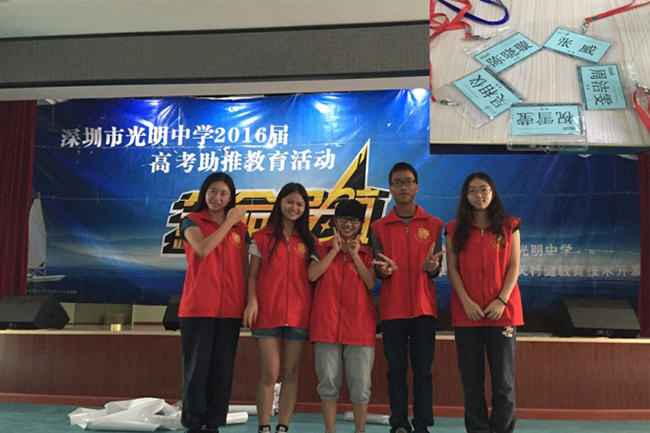 2015年10月25日,深圳市光明中学组织高三学生进行为期一天的生命导航——“高考助推”活动。我系“凌霄志愿服务队”秉承服务他人、服务自我的理念,派出5名志愿者,以助教的身份参与此次的高考助推活动。