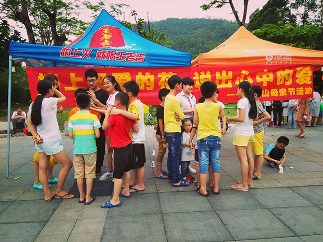 活动于下午进行,虽逢一阵无情雨,但我系学生不辞劳苦,将活动物资和帐篷搬到火炉山下,对活动开展的热情如火如荼。活动开展期间,我系学生为居民们准备了丰富的活动以及各色各样的奖品,如背对背夹气球、踩气球、你比我猜、变废为宝DIY手工等活动,另外还设有猜谜语送康乃馨,向妈妈送上节日祝福环节。游戏中,孩子们兴致勃勃,毫不畏生,与其他小朋友玩成一片,而在DIY环节中,孩子与妈妈们齐心协力,编织出美丽的手工佳作。