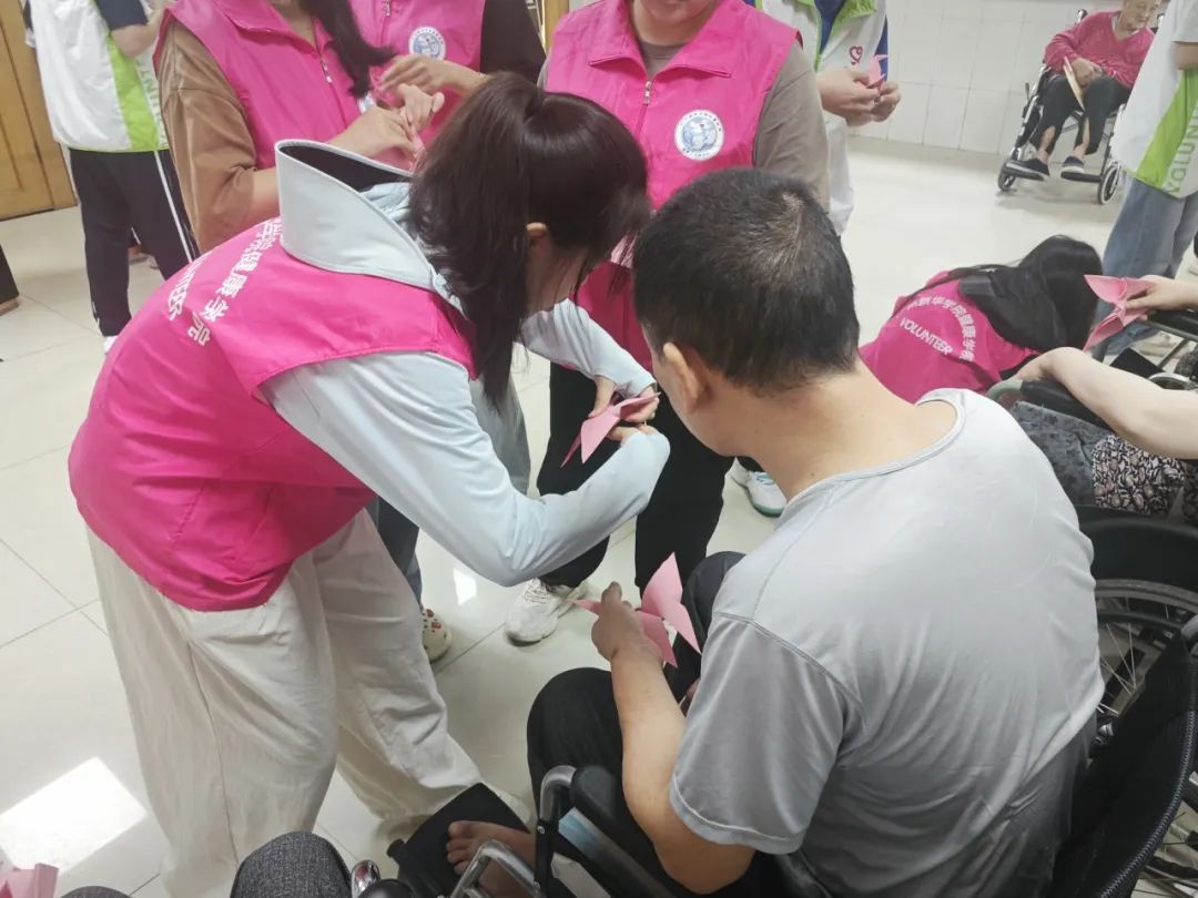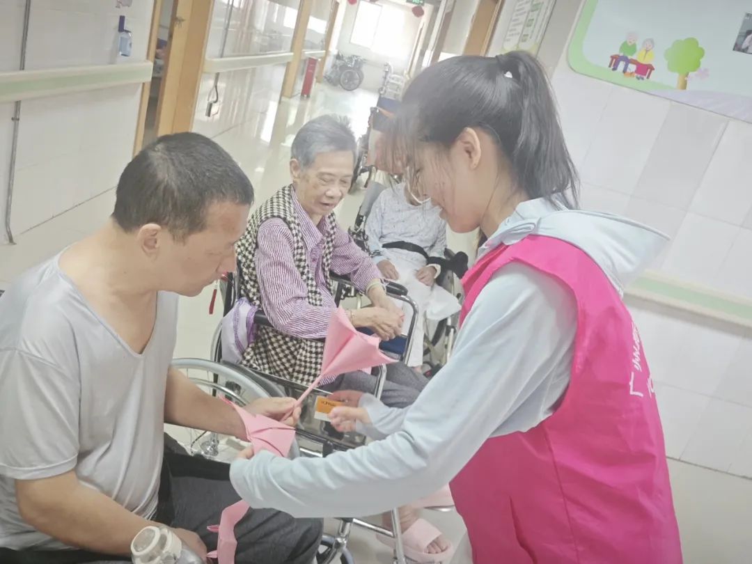 活动中最引人注目的环节莫过于教老人折纸。志愿者耐心地、手把手地教老人们折纸花,从对折、翻折到塑形,每一个步骤都细致入微。老人们觉得十分有趣,学得非常认真,折得非常用心,志愿者不时发出欢快的笑声,老人们也被志愿者的青春洋溢所感染,眉眼也露着几分温柔与笑意。当他们亲手折出一朵朵美丽的纸花时,忍不住显摆的可爱动作让整个养老院都充满了温馨与幸福。