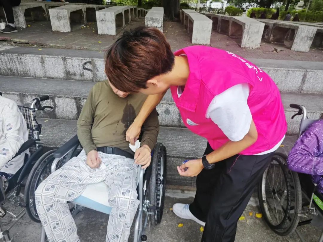 一幕无比温暖的场景:一位行动不便的老人突然身体不适,不小心呕吐了出来,然而,身旁的志愿者没有丝毫的迟疑与嫌弃,而是一点点,细致地为老人擦掉嘴角及衣物上的污渍。他专注的神情,传递着无尽的爱意和耐心。