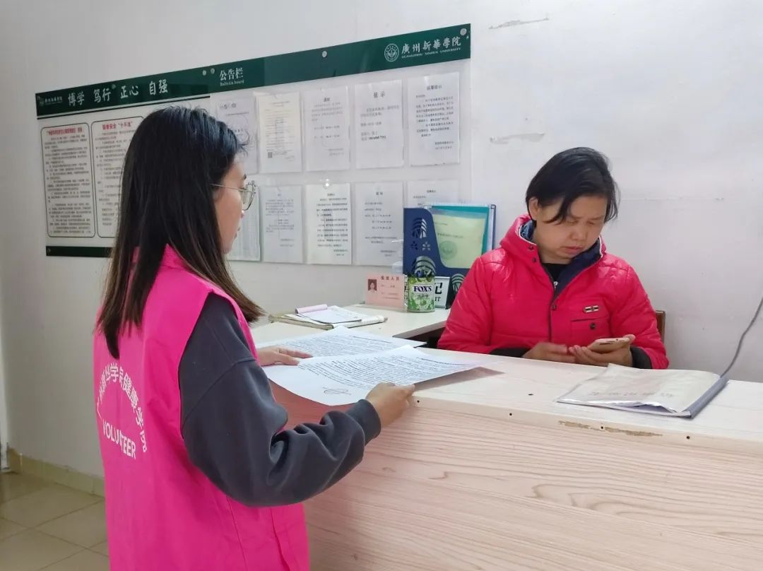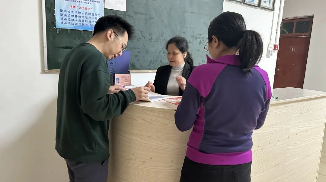 (图为志愿者与学生宿舍宿管交流)