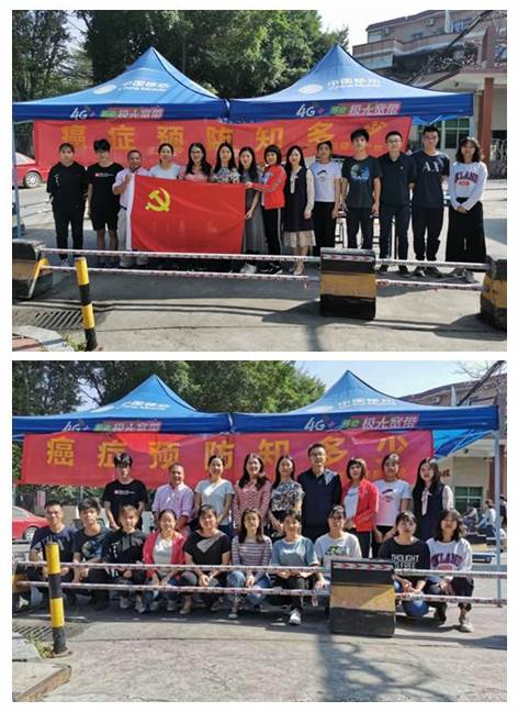 为深入开展“不忘初心、牢记使命”主题教育,积极落实《健康中国行动(2019—2030年)》,提高社区居民健康意识,2019年11月19日上午,中山大学新华学院suncitygroup太阳集团师生联合党支部组织2018级健康服务与管理专业(以下简称健管专业)学生在我校北门和火炉山森林公园开展主题为 “癌症预防知多少”的健康宣教活动。suncitygroup太阳集团党总支书记周旭毓副院长、党总支副书记马丽娟、全体教工党员和18健管专业学生代表参加了本次活动。