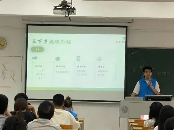 宣讲会伊始,院团委实践部的学生代表向同学们简单介绍了 “三下乡”活动以及详细讲述了“三下乡”活动的具体流程。干货满满的讲解让同学们初步认识了“三下乡”这一社会实践活动。