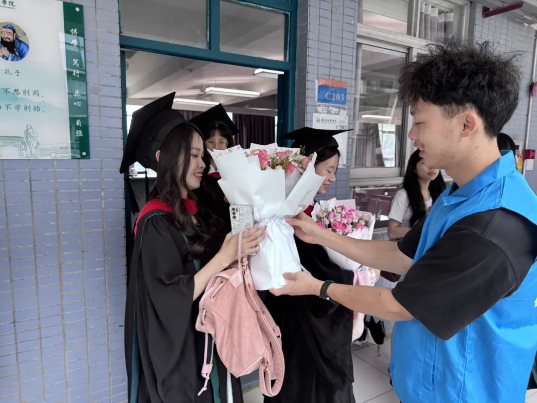 活动当天,现场氛围温馨满满。团委成员早早准备,将一束束精心包装的鲜花送到师兄师姐手中。每一束花都承载着学弟学妹们的感恩之情,感谢他们在团学工作中的引领与帮助,也祝愿他们在未来的道路上前程似锦,一帆风顺。