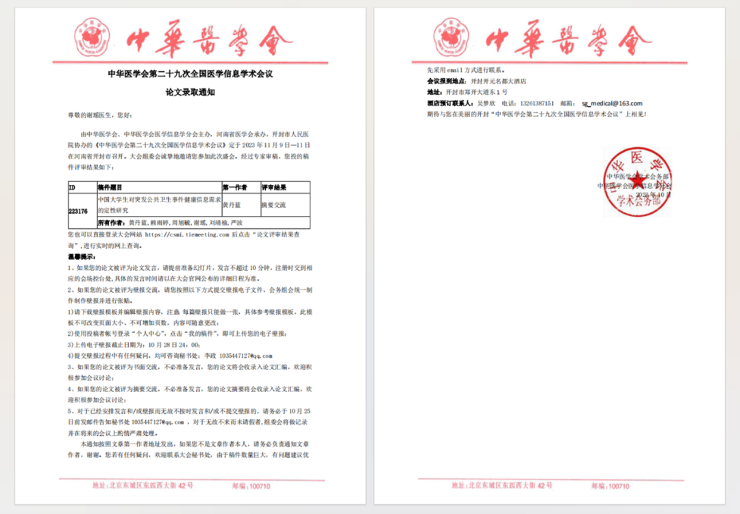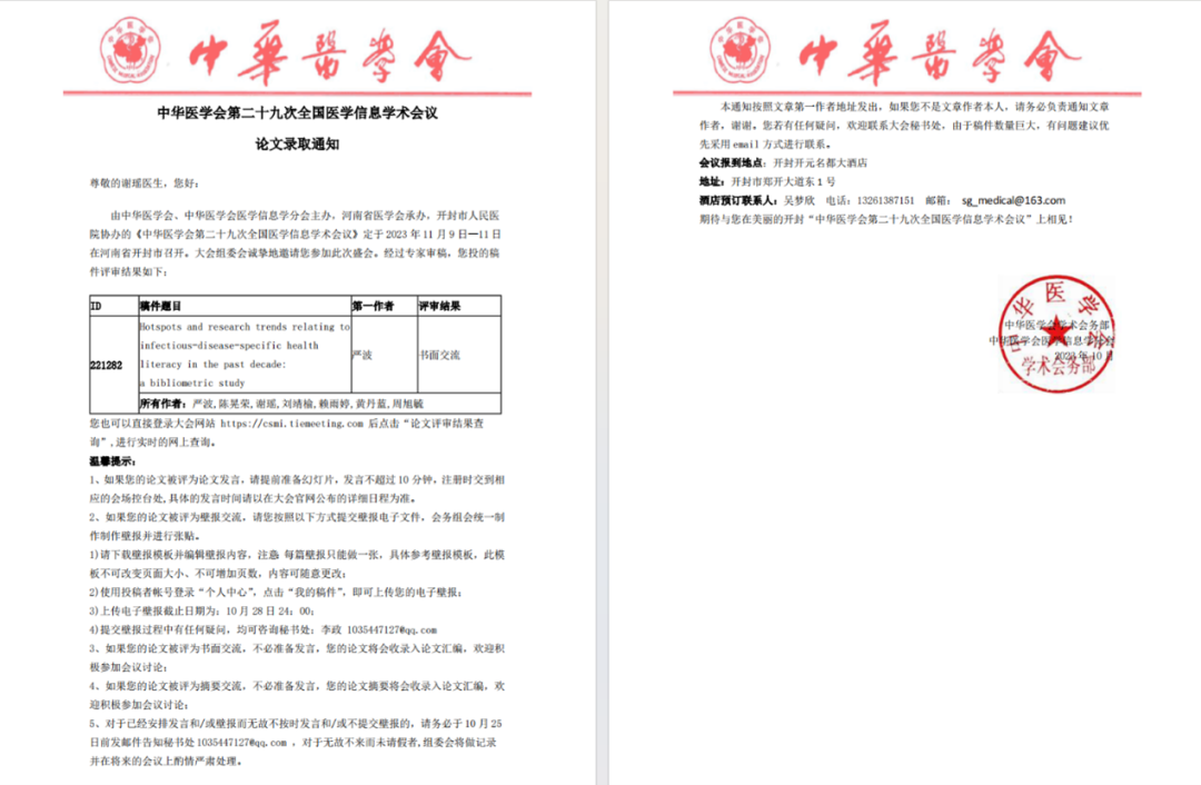 (2)2023年10月,作为第三作者参与论文《中国大学生对突发公共卫生事件健康信息需求的定性研究》撰写、作为第四作者参与论文《Hotspots and research trends relating to infectious-disease-specific health literacy in the past decade: a bibliometric study》撰写并被录用,在中华医学会第二十九次全国医学信息学术会议上分别作摘要交流和书面交流。