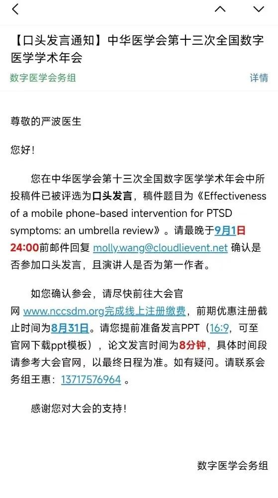 (图六、七:中华医学会第十三次全国数字医学学术年会第二作者论文录用信息及口头发言通知|录用时间2024年8月)